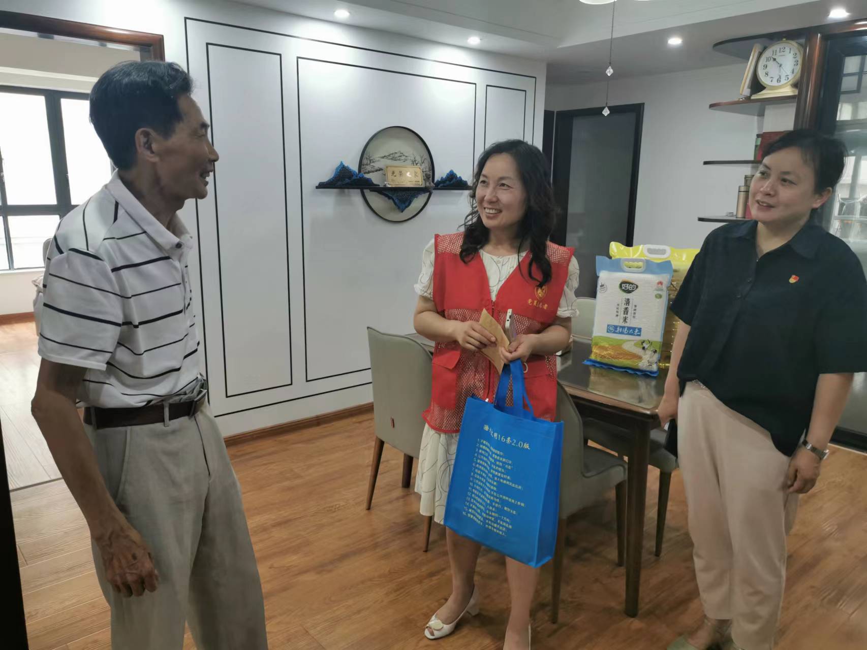 在天逸華庭小區(qū),志愿者們看望55年黨齡的老黨員甘黃興,關(guān)切地詢問(wèn)他的家庭狀況、日常生活,表達(dá)對(duì)他多年發(fā)揮黨員先鋒模范作用、敬業(yè)奉獻(xiàn)的敬意,鼓勵(lì)他繼續(xù)弘揚(yáng)光榮傳統(tǒng),發(fā)揚(yáng)優(yōu)良作風(fēng),關(guān)心和支持社區(qū)工作。