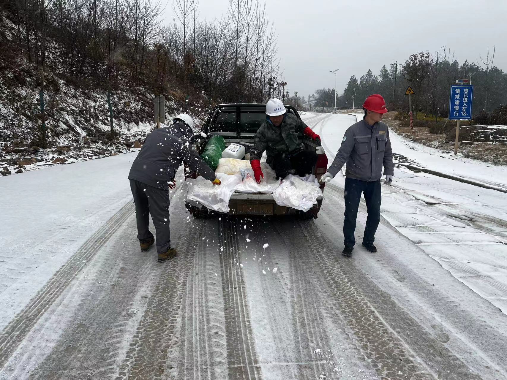 根據(jù)實時天氣變化和道路狀況,興全礦業(yè)提前做好詳細的融雪防滑預(yù)案和應(yīng)急物資準備,第一時間安排人員至運輸?shù)缆窉伻鋈谘﹦?,組織人工鏟雪,防止道路結(jié)冰,保障運輸安全。